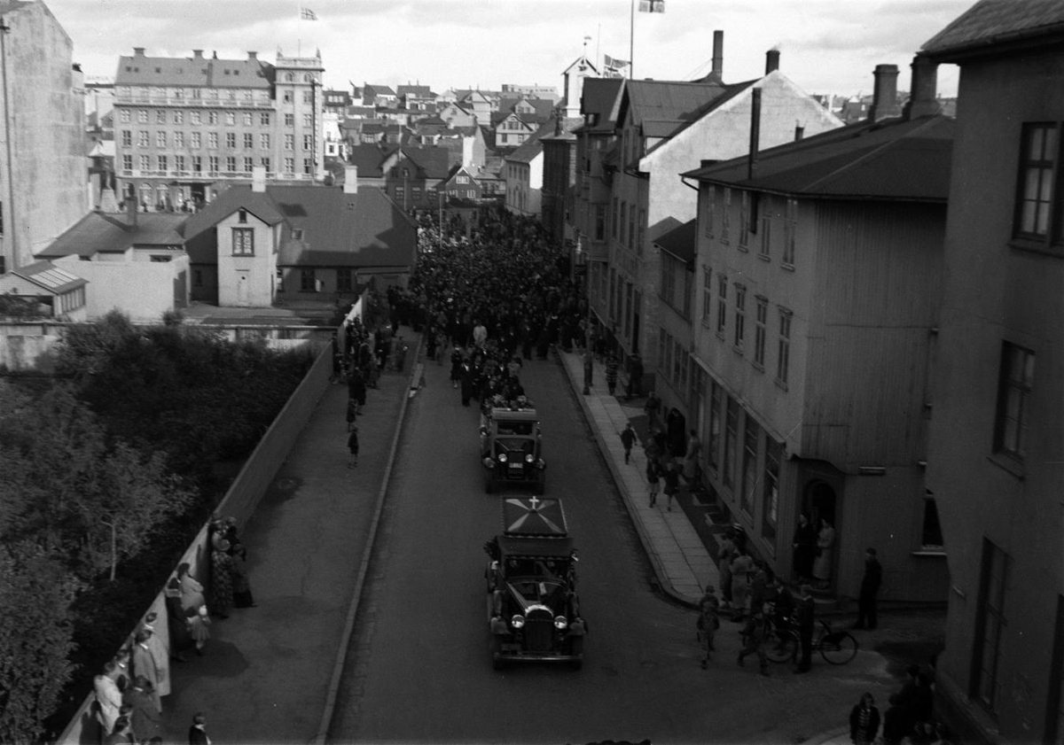 fjöldi fólks beggja megin götunnarJarðarför Guðrúnar Lárusdóttir og dætra,