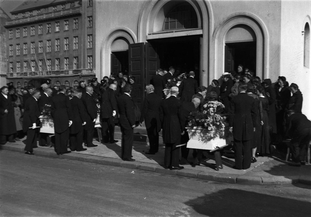 Kistum komið fyrir á pöllum . Jarðarför