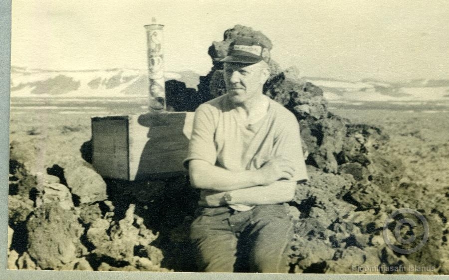Guðmundur Jónasson fjallabílstjóri situr á hraunvörðu.