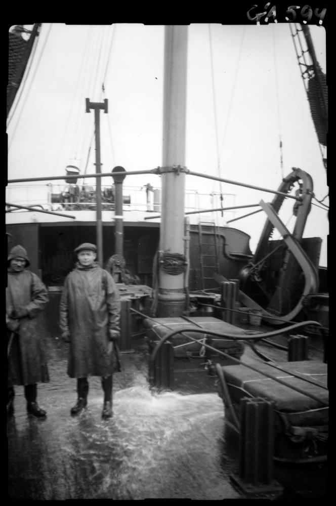 Um borð í togara og sér fram eftir þilfarinu: númeruð lestarop, gálgabeygja bundna við stjórnborðsgálga o.fl. Tveir sjóklæddir menn á dekki og nót annar hálfur. Hinn er með derhúfu.