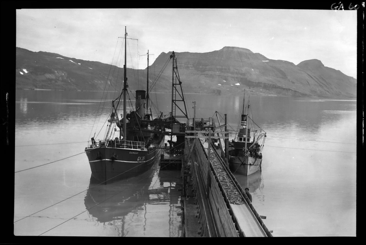 Togari og bátur sitt hvoru megin við löndunarbryggju. Fjöll í baksýn. Á togaranum stendur Garðar GK 25, en bátnum GK 10. Verið er að landa síld úr Garðari með löndunarkrana. Færiband gengur upp bryggjuna og sést síld á því.