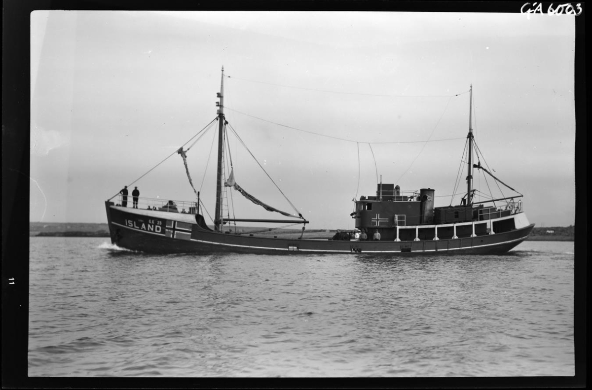 B/V Edda GK 25 á siglingu út Hafnarfjörð. Skipið er þjóðernisauðkennt (eins og gert var á stríðsárunum). Í baksýn lág strandlengja.