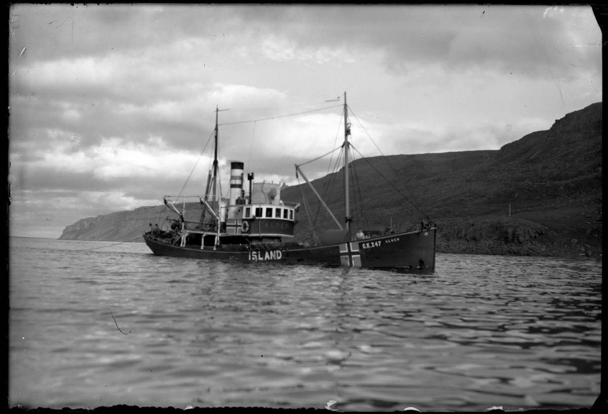 Línuveiðarinn ALDEN GK 247 útbúinn til síldveiða. Skipið er þjóðernisauðkennt. Lína liggur frá því aftanverðu. Fjallshlíð í baksýn sem endar lengst til vinstri og sér þá í auðan sjó. Nokkrir staurar neðanlega í hlíðinni.