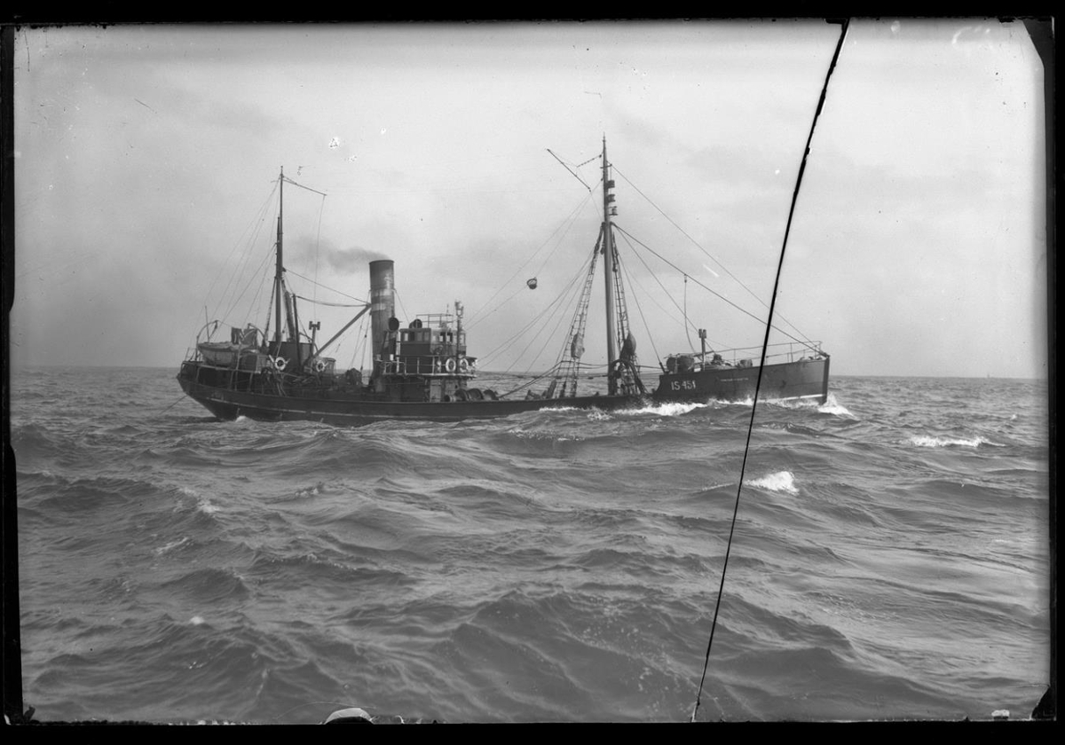 Togarinn IS 451 að veiðum. Skipið sést á hlið. Auður sjór í for- og bakgrunni.