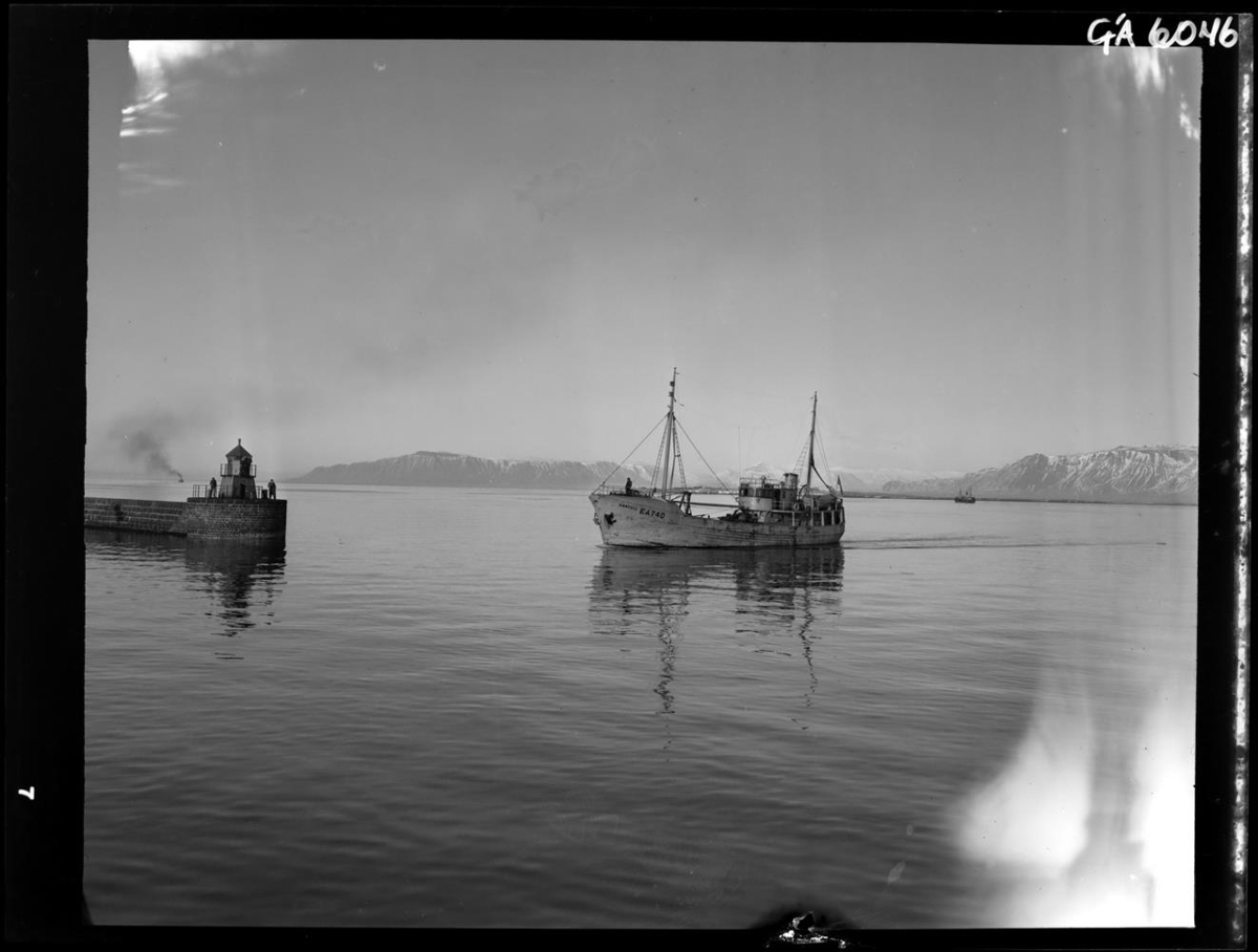Fiskiskipið Snæfell EA 740 í þann veginn að sigla inn um hafnarkjaftinn í Rvík. T.v. viti í enda Norðurgarðs. Í baksýn: Engey, sunnar bátur, Akrafjall og Esja.