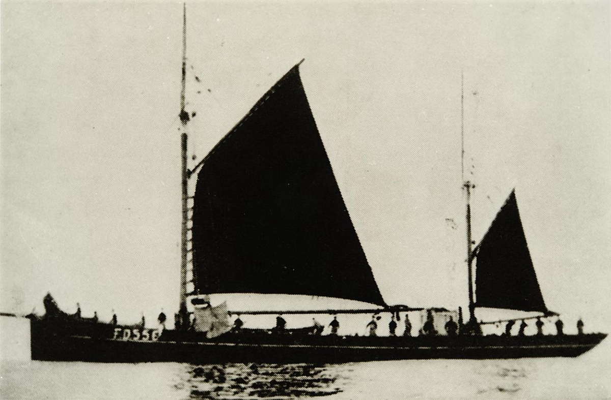 Seglskip, tvímastra og frekar lágbyggt. Segl uppi á báðum möstrum og eru allmargir um borð. Á kinnung stendur: F.O. 550.