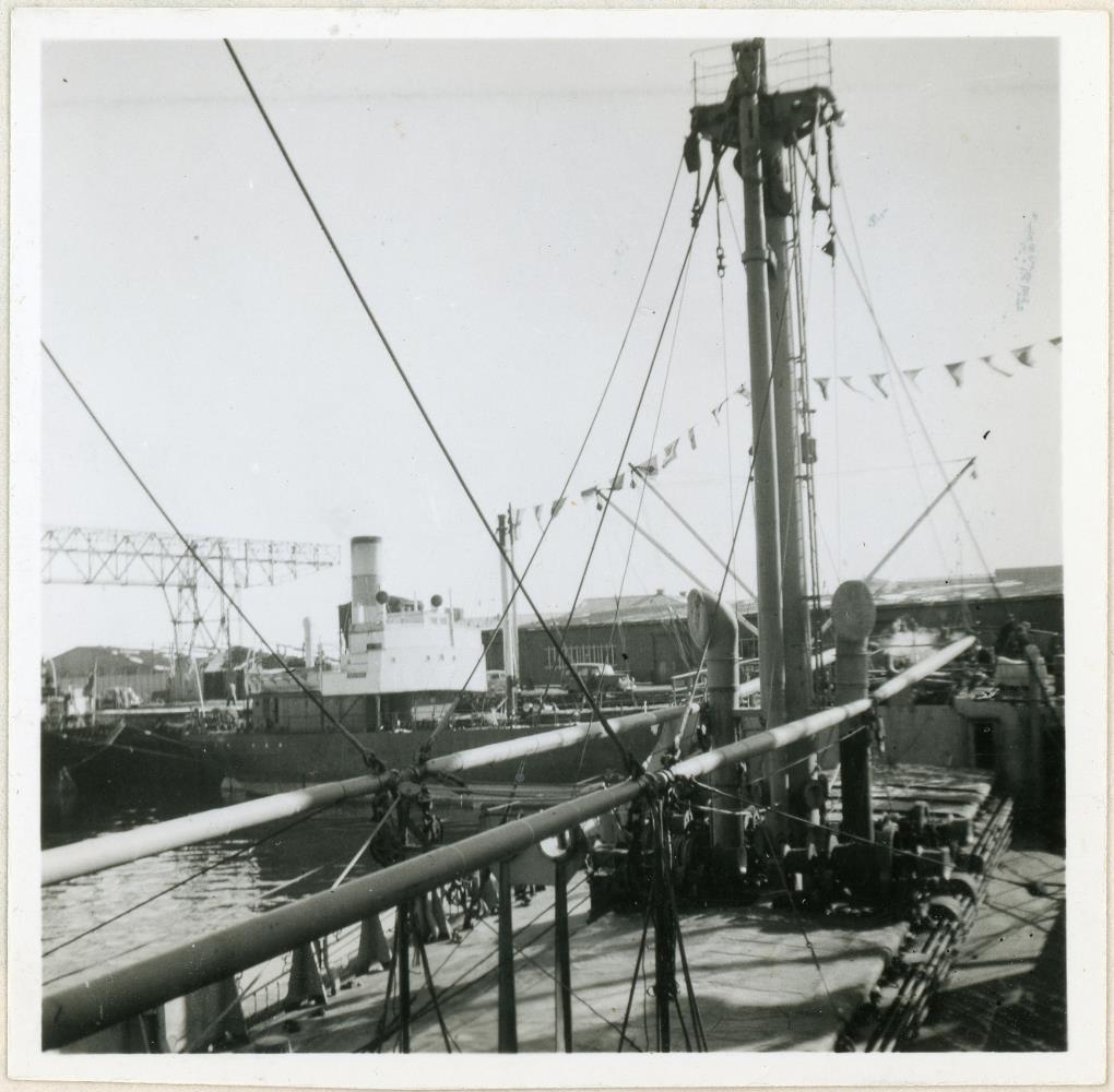 Horft fram eftir þilfari flutningaskips, annað slíkt í baksýn og t.v. má sjá Kolakranann við höfnina