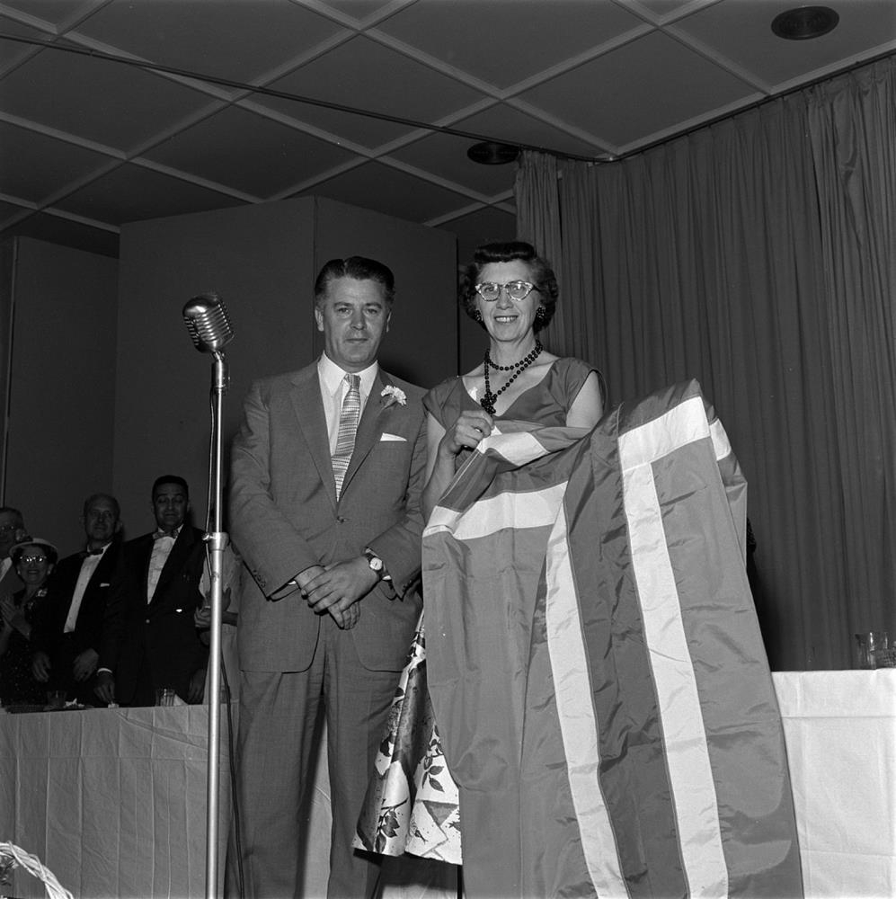 Utah. Bandaríkjunum. Karl og kona í sparifötum við hljóðnema í samkomuhúsi og með íslenskan fána. Sér í menn, líklega hljómsveitarmenn í bakgrunni. Pétur Eggerz sendifulltrúi í Washington D.C. afhendir Fay Bearnson, Spanish Fork íslenska fánann. Ljósmyndari J. M. Heslop. Júní 1955. Filma 6x6.