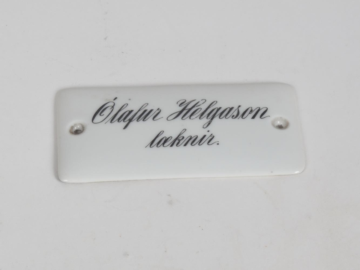 Nafnskilti úr postulíni. Á það er letrað: Ólafur Helgason læknir. Var á hurð á lækningastofu Ólafs.