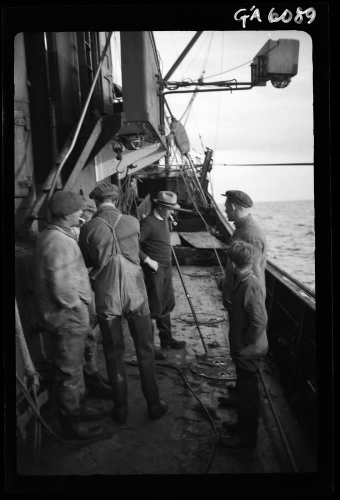 Þrír karlmenn og einn drengur í hnapp á þilfari togara. Sér fram eftir skipinu stjórnborðsmegin frá brúarvæng og fram á hvalbak. Þrír mannanna eru augljóslega sjómenn, í vinnufötum, stígvélum og blússum og með húfur. A.m.k. einn reykir sigarettu. Drengurinn er berhöfðaður. Fjærst á mynd um miðju maður með ljósan hatt, reykjandi pípu, íklæddur dökkri peysu og buxum og á stígvélum. Að baki hans sér á þrífót til myndatöku.