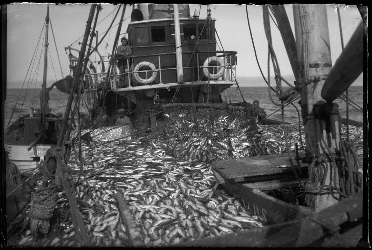 Togari að síldveiðum. Sést á skipið frá mastri og aftur eftir. Dekkið fullt af síld og á miðri kösinni fullur háfur. Maður á brúarvæng heldur í línu frá háfnum. Tvær aðrar línur liggja frá háfnum út fyrir borðstokkinn, en þar sér á öxl af manni. Á brúarvæng togarans eru tveir bjarghringir og á þeim stendur "Ver, Hafnarfjörður". Lítill mótorbátur er við skipssíðuna á móts við brú, sést á hann aftanverðan. Á skut bátsins stendur "...ram, Hnífsd...". Tveir menn um borð í bátnum. Einnig nokkrir menn á þilfari togarans.