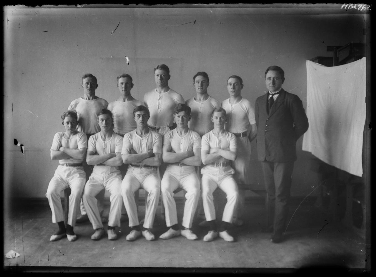 Leikfimiflokkur Ungmennafélags Eyrarbakka (U.M.F.E.) eldri deild. Flokknum mun hafa verið komið á fót á Eyrarbakka 1921-22. Stjórnandi var Ingimar Jóhannesson kennari og er hann lengst til hægri á myndinni. Aðrir eru: Neðri rö- talið frá vinstri: Sigurður Ólafsson vélstjóri, Sandprýði, Konráð Guðjónsson vélstjóri, Hólmsbæ, Kári Sigurðsson trésmíðameistari, Káragerði, Kristbjörn Markússon sjómaður, Steinsbæ og Konráð Gíslason kaupmaður, Káragerði. Efri röð talið frá vinstri: Ólafur Jensson bifvélavirki, Llitlu-Háeyri (Jensbæ), Helgi Guðlaugsson sjómaður, Mundakoti, Steingrímur Gunnarsson bísltjóri, Strönd, Ásmundur Guðnason sjómaður Einarshöfn, Marel Þórarinsson verkamaður og sjómaður Neistakoti.