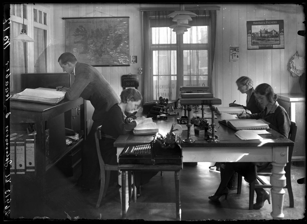 „Frá skrifstofu ÓJ&K í Hafnarstræti (Fálkahúsinu), líklega 1936. F.v. Magnús Andrésson, Sigríður Kjerúlf, Helga Jónsdóttir og Sigríður Kristinsdóttir Johnson.“ (HGJ 2015)