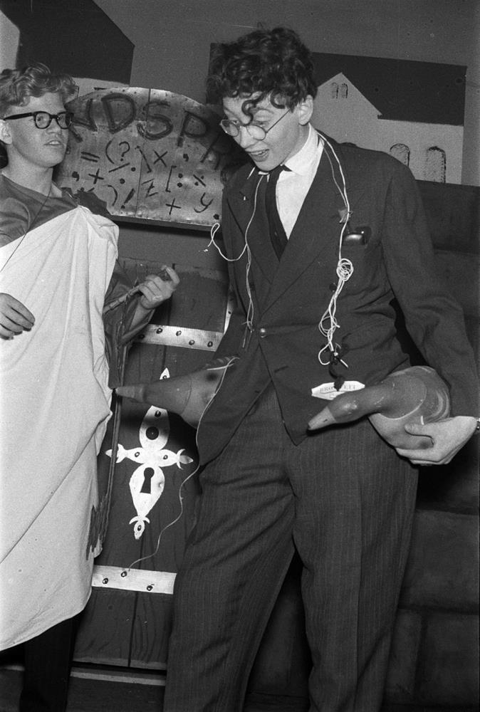 Gagnfræðaskóli Vesturbæjar. Reykjavík. Leikendur á sviði við gullna hliðið sem er með áletruninni LANDSPRÓF. Í baksýn tjald með mynd Menntaskólans Í Reykjavík. Árshátíð Gagnfræðaskóla Vesturbæjar. Leikritið Sálin hans Denna eftir Helga Skúla Kjartansson. Helgi Skúli Kjartansson t.h. Birt í Lesbók Morgunblaðsins 14.3. 1965. Filma 35 mm.