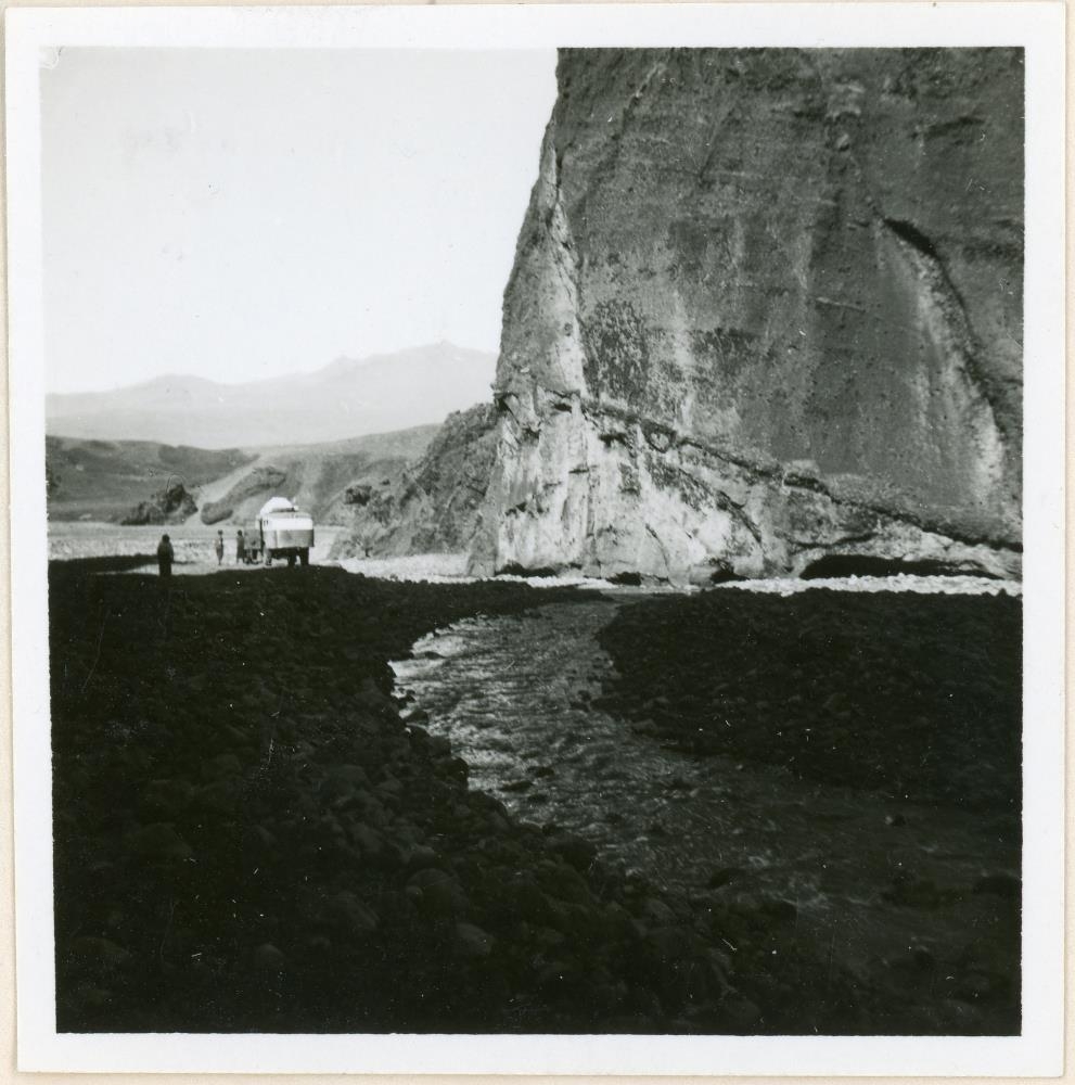 Í mynni Stakkholtsgjár, Bedford fjallarútan bíður eftir göngufólkinu úr gjánni.