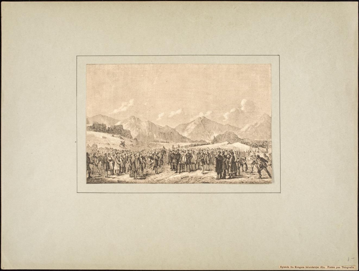 Prentm. (xylographia), 15 x 23 cm., úrklippa úr Illustreret Tidende, límd á 33,5 x 44 cm. blað: Frá Þjóðhátíð á Þingvöllum 1874, nefnd Episode frá Kongens Islandsrejse 1874. Festen paa Thingvalla. Merkt Pauli?