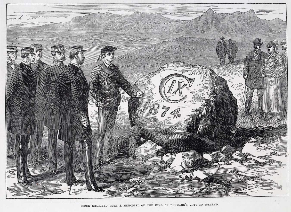 Mynd af Kristjáni IX ? og fylgdarliði við stein með áhöggnu fangamarki hans CIX 1874.
