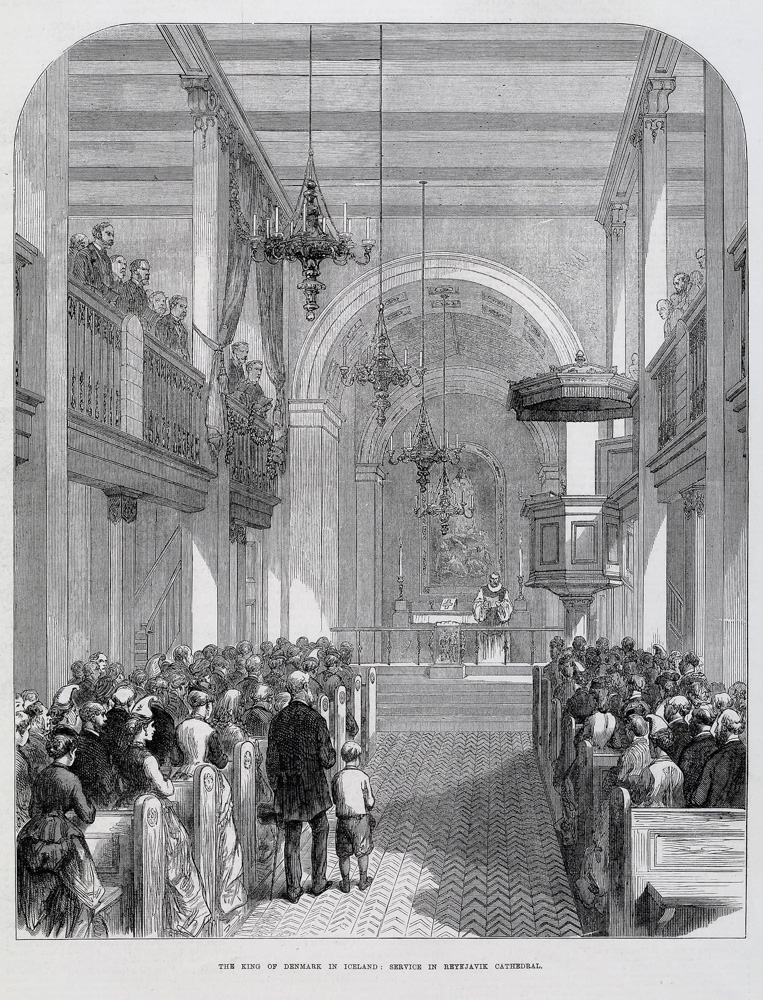 "The King of Denmark in Iceland: Service in Reykjavik Cathedral". Konungur og aðrir gestir hlýða messu í Dómkirkjunni 2. ágúst 1874. Pétur biskup Pétursson fyrir altari.
