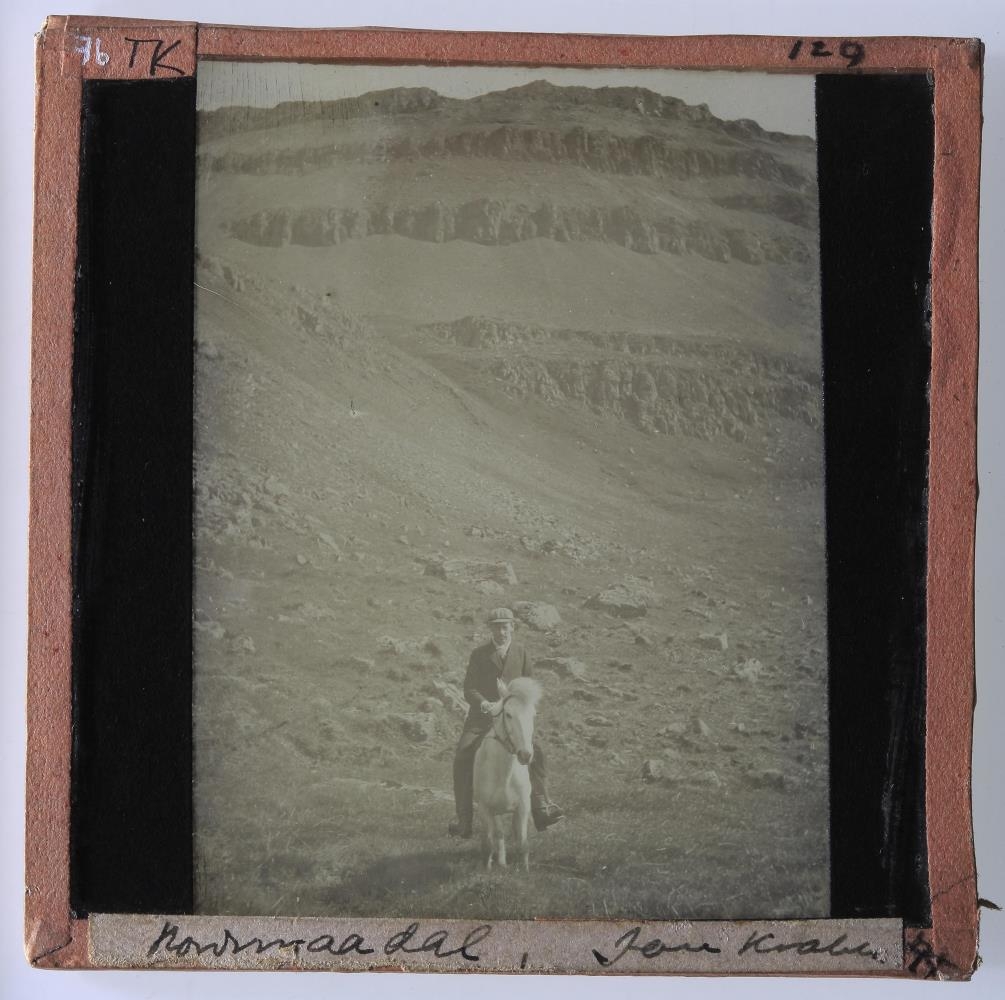 Maður ríðandi á hesti við fjallshlíð. Fjall í bakgrunni. Jón Krabbe.