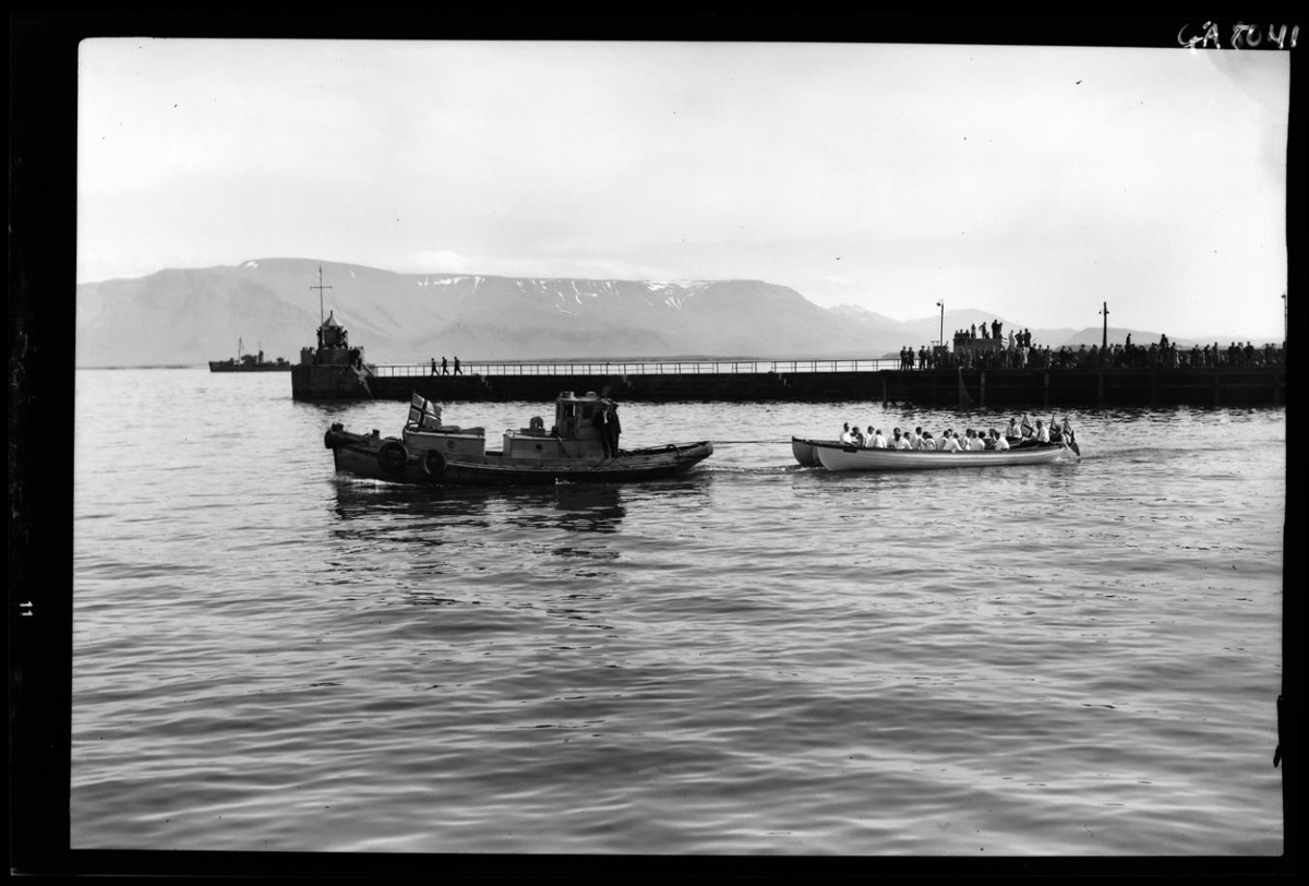 Frá sjómannadeginum í Reykjavík að öllum líkindum 3. júní 1945. Kappróðrarbátar dregnir að rásmarki við Örfirisey af lóðsbátnum JÖTNI.
