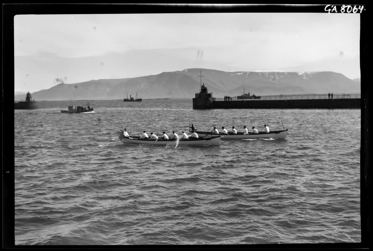 Lóðsbáturinn Jötunn á siglingu eftir að hafa dregið kappróðrarbáta að rásmarki