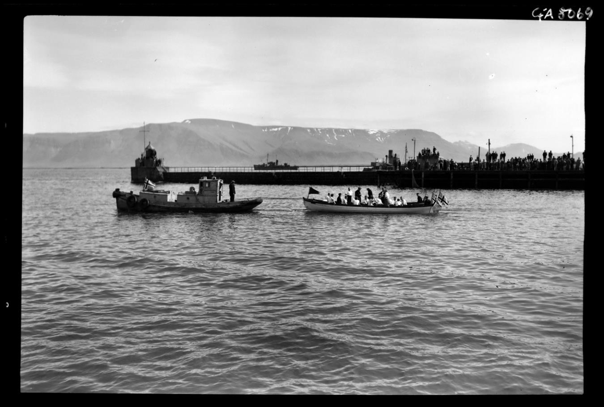 Lóðsbáturinn JÖTUNN að draga kappróðrarbáta að rásmarki við Örfirisey.