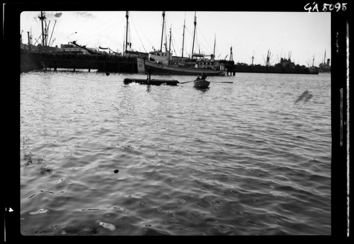 Á bak við flekann er fiskibátur sem ber skráningarnúmerið MB 30 ( sbr. nr. 8150). Hér er um að ræða Aðalbjörgu sem smíðuð var í Svíþjóð 1946, en fyrst skráð 4.12. 1947. Þó er talið að Aðalbjörg hafi komið fyrr til landsins eða í ársbyrjun 1947 og e.t.v. haft bráðabirgðaskráningu. Árið 1959 varð hún Hrefna EA 33, sem fórst 27. 7. 1964.