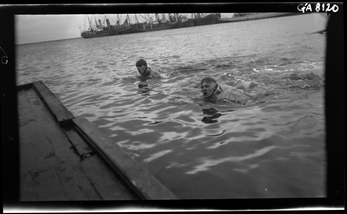 Sundmaður til vinstri er hugsanlega Markús Guðmundsson, þá háseti á b.v. Jóni Ólafssyni, síðar skipstjóri í Rvík. Nú til heimilis að Markarflöt 47, Garðabæ. - Sjálfur telur Markús óvíst að þett sé hann (30.01.1990)
