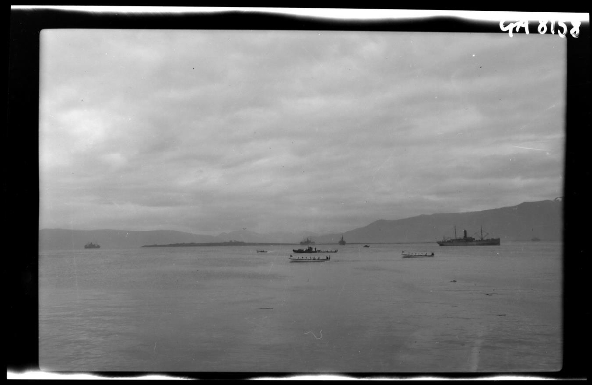 Engey í bakgrunni og ýmis flutningarskip. Um miðja mynd, hjá kappróðrarbát, er lóðsbáturinn Jötunn (sbr. nr. 8032).