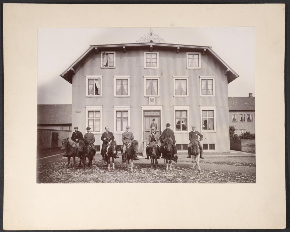 Lækjartorg. Ditlev Thomsen stendur á tröppum Hótel Heklu (þá tilheyrandi Thomsens verlsun), en fyrir framan eru 7 menn á hestbaki, nöfn þeirra sem þekkjast skrifuð á bakhlið. Sama mynd og Þjms. Mms-23536.