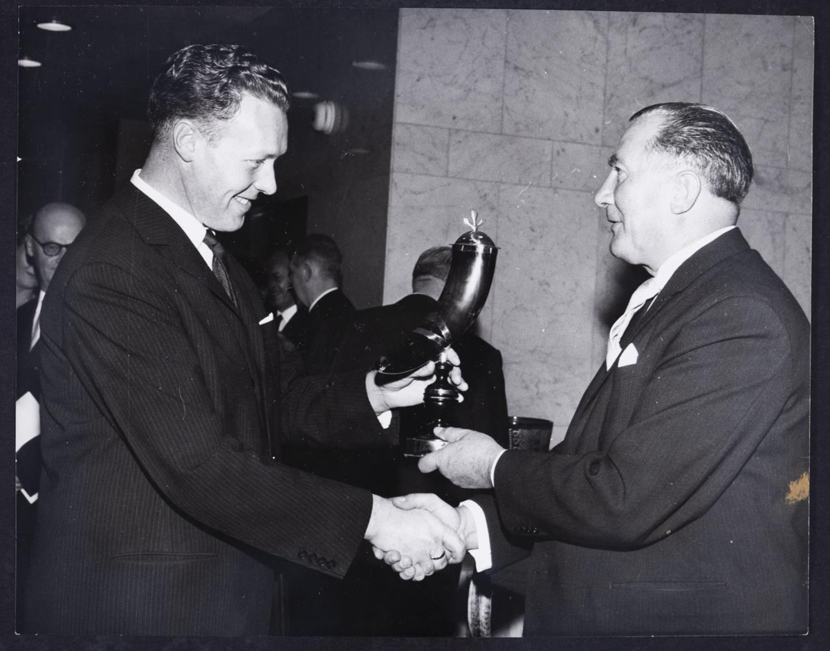 Ýmislegt. „Erlendur Einarsson afhendir L.Cooke, forstjóra CWS [Co-operative Wholesale Society], forkunnarfagurt drykkjarhorn að gjöf frá SÍS í tilefni aldarafmælis hins enska systursambands.“