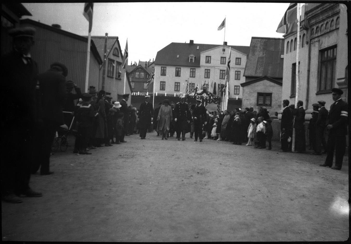 Konungshjónin ganga ásamt fylgdarliði um götu. Fólk fylgist með. Menntaskólinn í baksýn. Konungskoma.