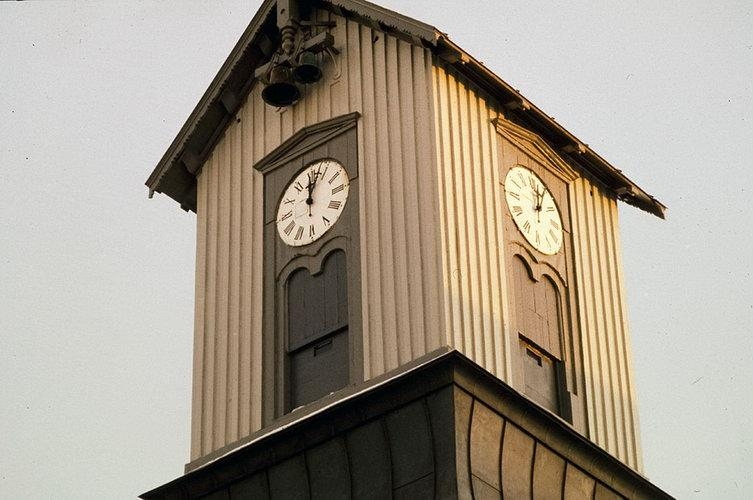 Turn Dómkirkjunnar. Klukkan á turnunum sýnir 12. Þröng mynd.