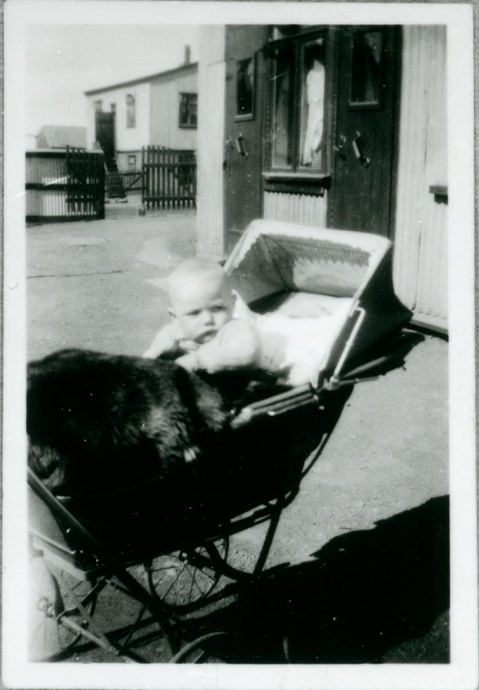 Í forgrunni er ungabarn í barnavagni, í baksýn sjást hús.