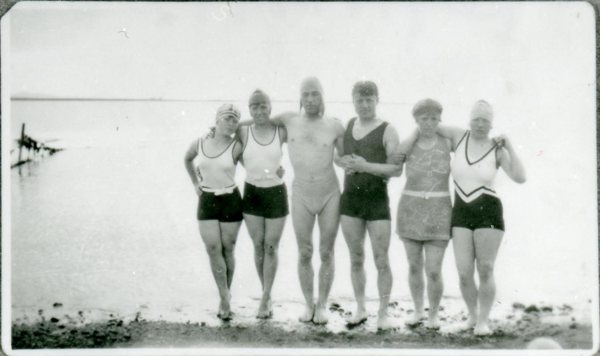 Í flæðarmáli standa sex sundmenn, fjórar konur og tveir karlar, í baksýn er sléttur sjór.