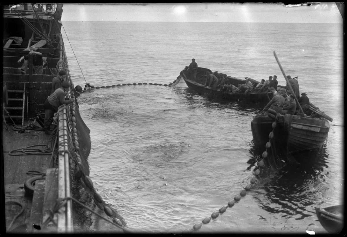 Tekið um borð í togara að síldveiðum. Sést niður á þilfar hans stjórnborðsmegin og er það hólfað sundur. Þrír menn á dekki, tveir við borðstokk, einn klofar yfir skilrúm og er sá með kokkshúfu. Klæðnaður hinna: nankinsjakki, samfestingur, bússur, húfur. Við skipssíðuna er nót, sýnilega stórt kast, og tveir nótabátar með mannskap í.