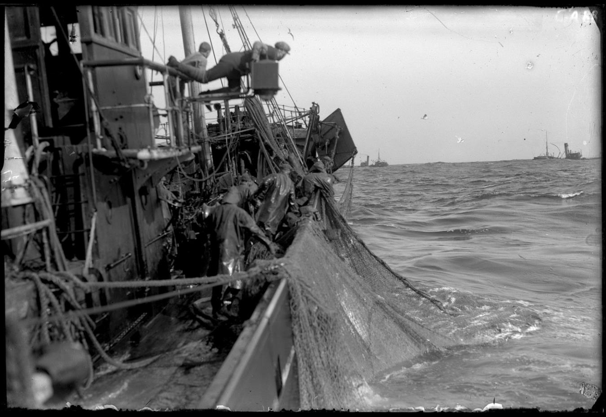 Þessi mynd er sennilega tekin á Selvogsbanka. Notað er s.k. enskt troll, en þá var toghlera lásað beint í trollið. Búið er að taka fyrsta pokann. Líklega er trollið rifið og pokinn hífður upp (eins og sjá má framarlega á skipinu) til að ná í rifuna. Hér er sem sagt eitthvað "óklárt" og skipstjóri liggur út á lanternu til að fylgjast með.