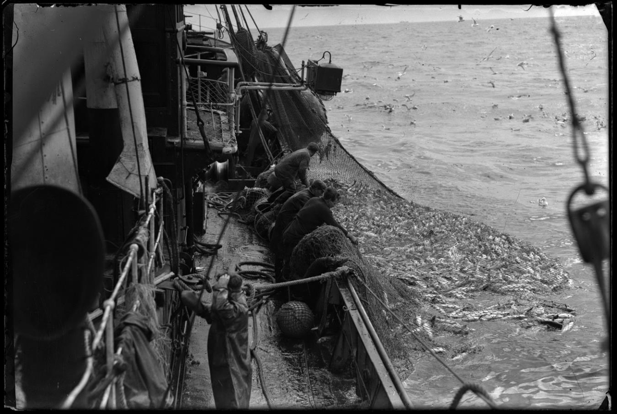 Tekið um borð í togara og sést hann á innanverðan stjórnborðsmegin. Skipið er að togveiðum. Verið að hífa pokann um borð, en belgurinn flýtur með fiski í við síðuna. Mannskapur (stakkur, derhúfur, peysur, nankinsjakkar, bússur) við störf á dekki.
