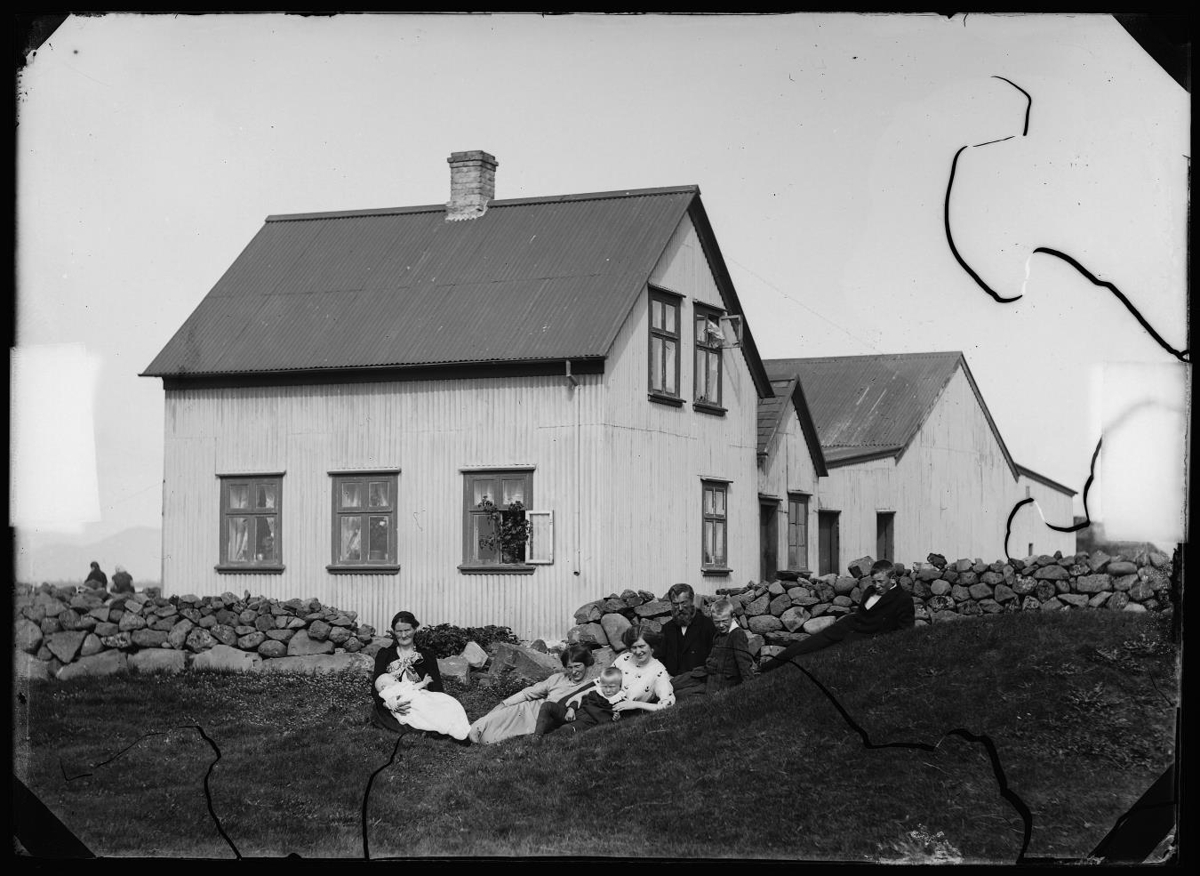 206. Ísland. Hús líklega í sveit. Portbyggt timburhús með risi með viðbyggðu inngönguhúsi sem líka er með risþaki og áföstu útihúsi. Grjótgarður er við húsið og í grasbala við hann er fjölskylda Hjón og tvær ungar konur og þrír drengir.