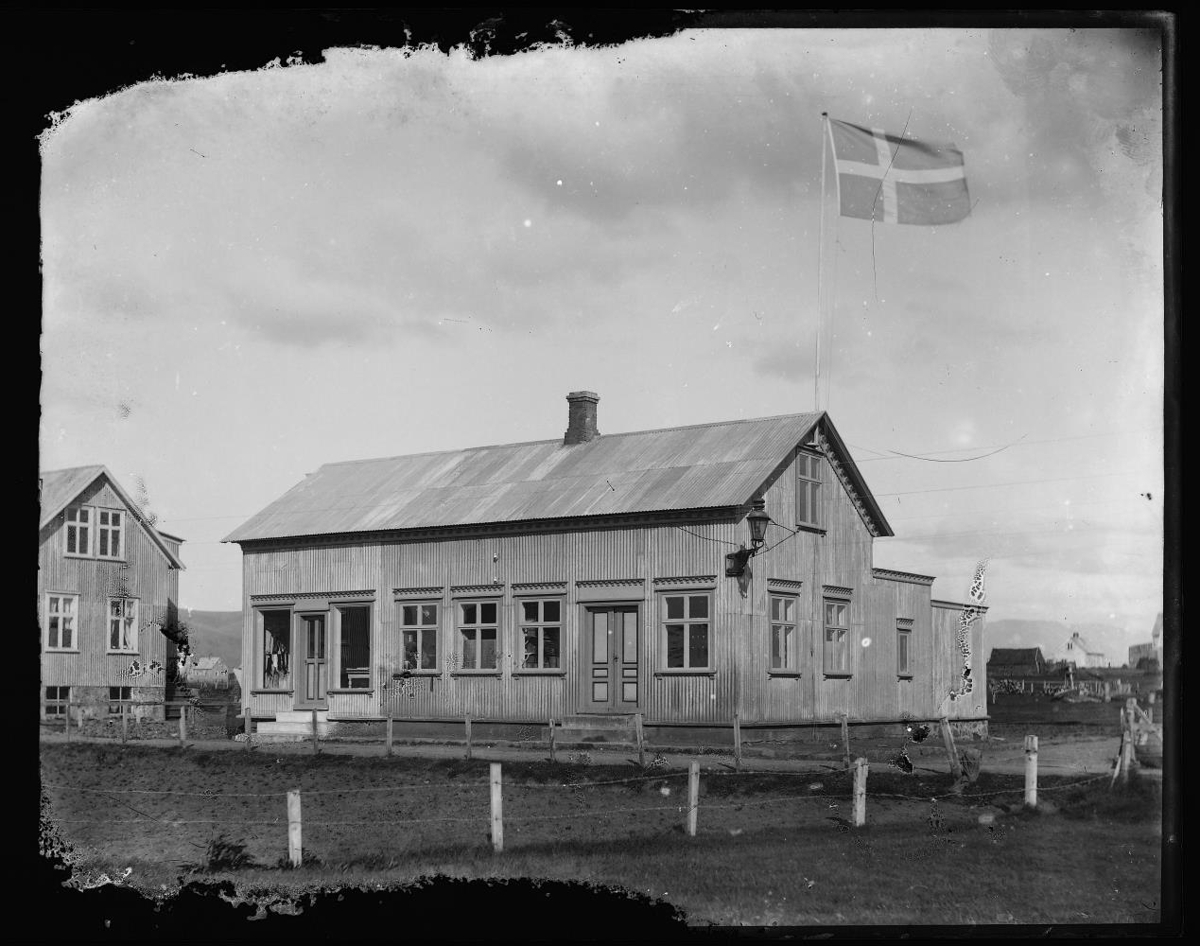fáninn. Sér í nærliggjandi hús, bæði timburhús og torfbæ, grindverk