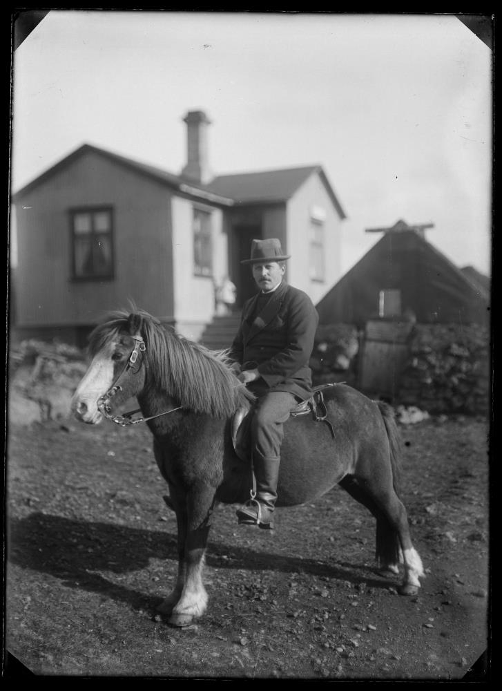 B. Egilsson útgerðarmaður í Hafnarfirði á hesti sínum.