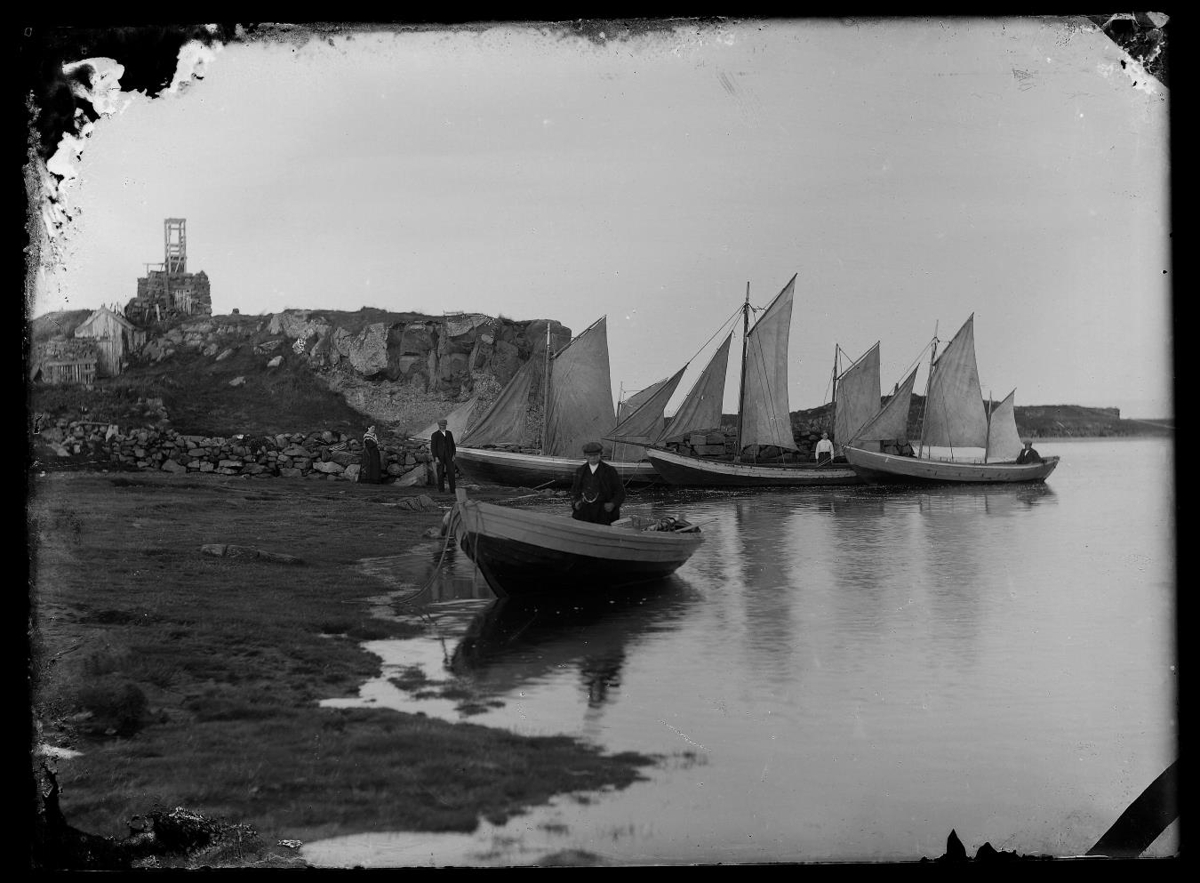 á hleðlsu uppi á klettinum. Lendingin í Bæjarsundi í Sviðnum. Bátar í aðallendingunni