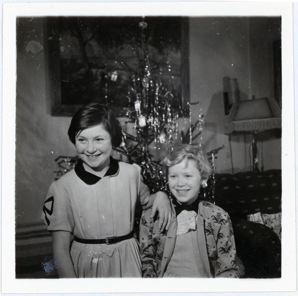 Tvær telpur í forgrunni og jólatré bak við þær.