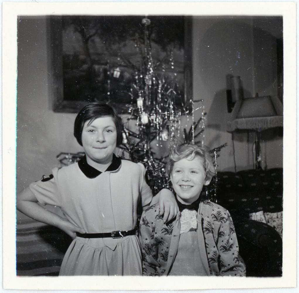 Tvær telpur í forgrunni og jólatré bak við þær.