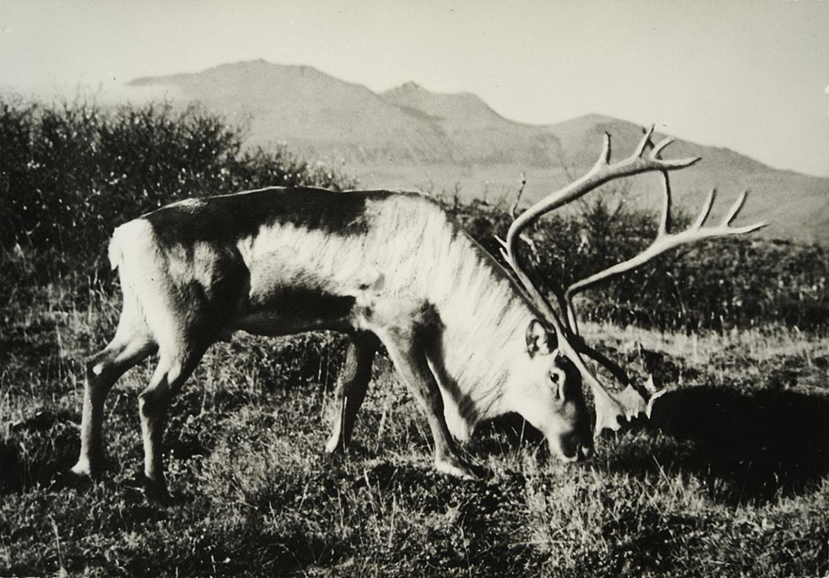 Ein af sex óupplímdum myndum sem hafa verið unnar fyrir póstkort. Myndin er af hreindýrstarfi á beit, hann er allur í mynd og sést vel á hornin.
