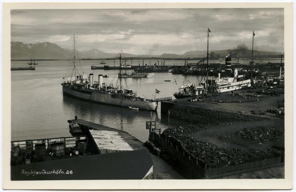 Skip. Varðskipið Fylla nær miðri mynd og fleiri skip við bryggju.