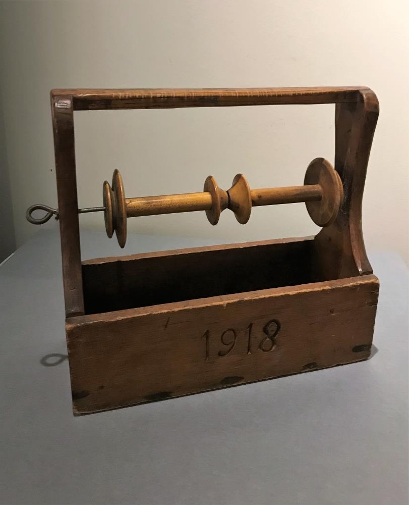 Snældustokkur, gerður fyrir tvær rokksnældur. Vanaleg gerð. Á aðra hlið er letrað G.H.D. og skákross, á hina ártalið 1918. Úr Berustaðabúi.