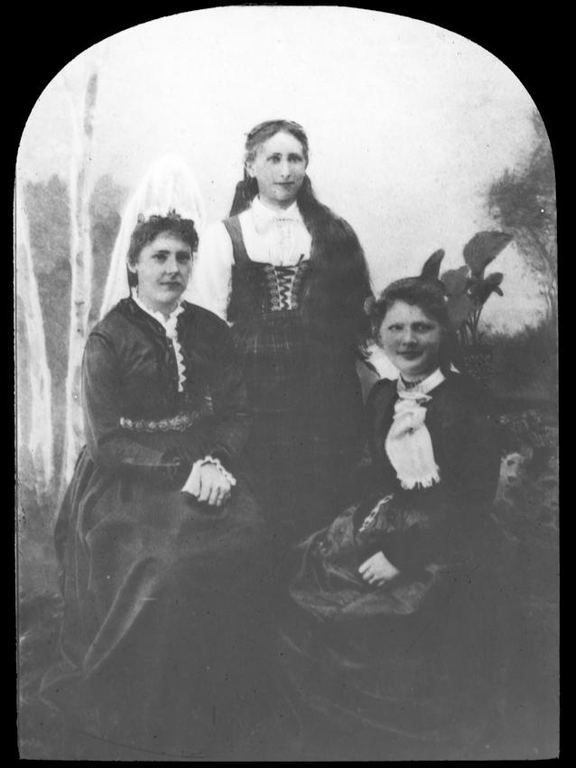 búningum. Ein í skauti, önnur í upphlut og sú þriðja í peysufötum.