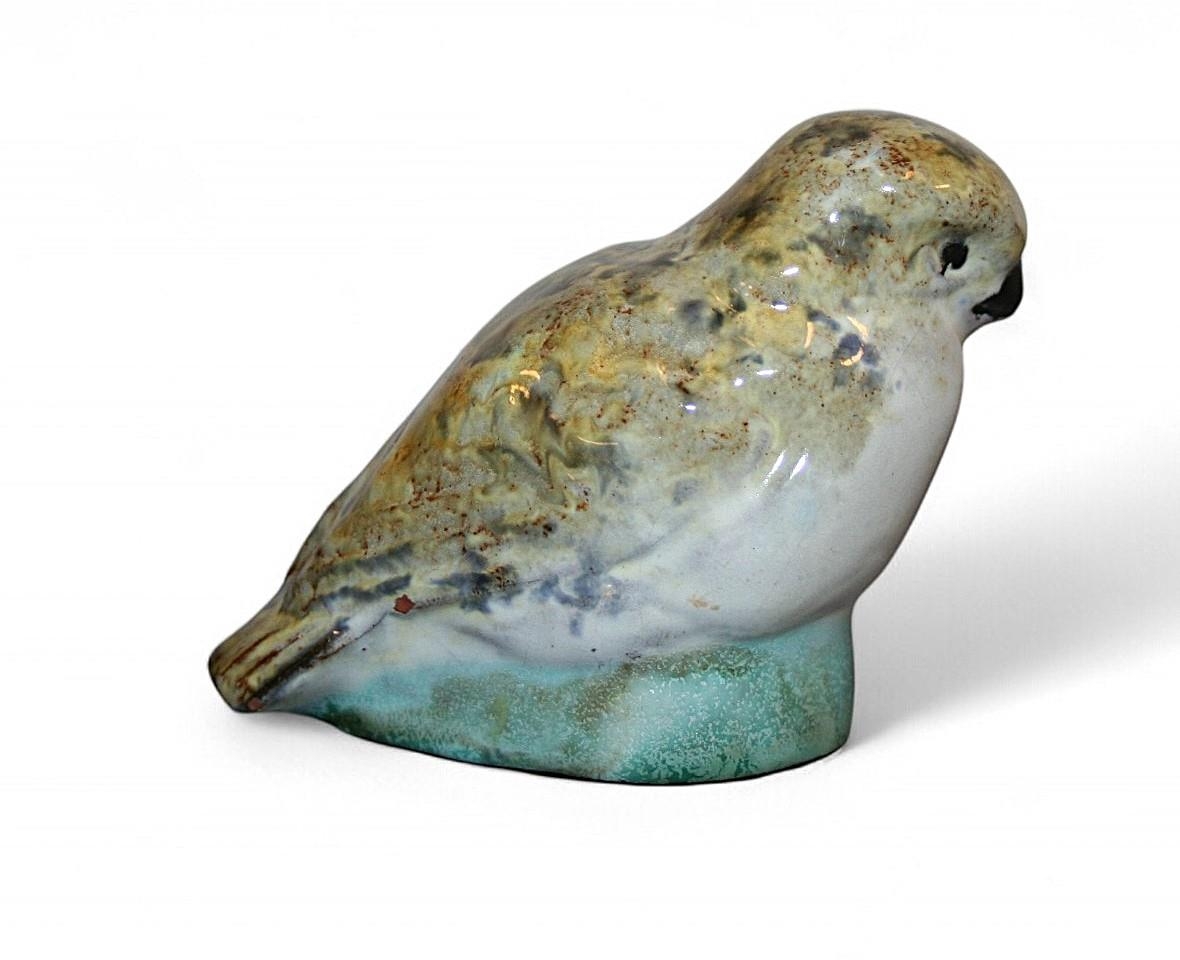 Lítill fugl með svartan gogg. Fuglinn er grárað neðan og mosgrænn að ofan og situr á grænum stalli.