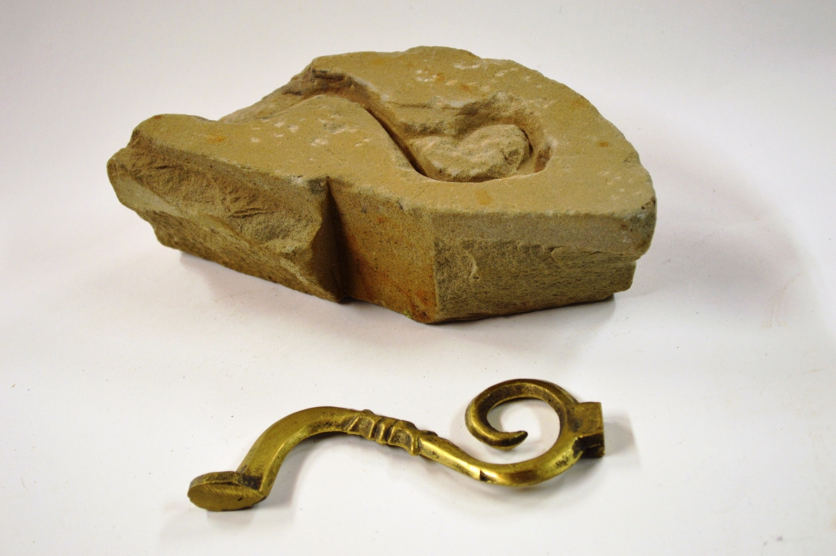 Steypumót rist í brot úr hverfisteini. Eftir því steypti Þórður Tómasson arm á ljósastjaka sr. Hálfdáns Gíslasonar frá 1776 í Skógasafni.